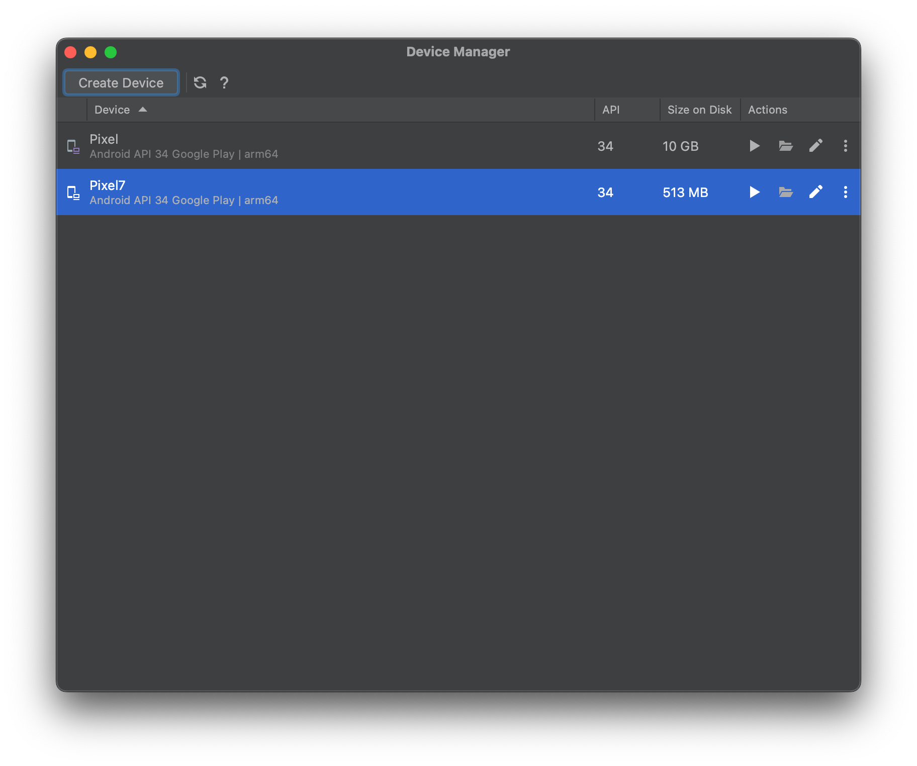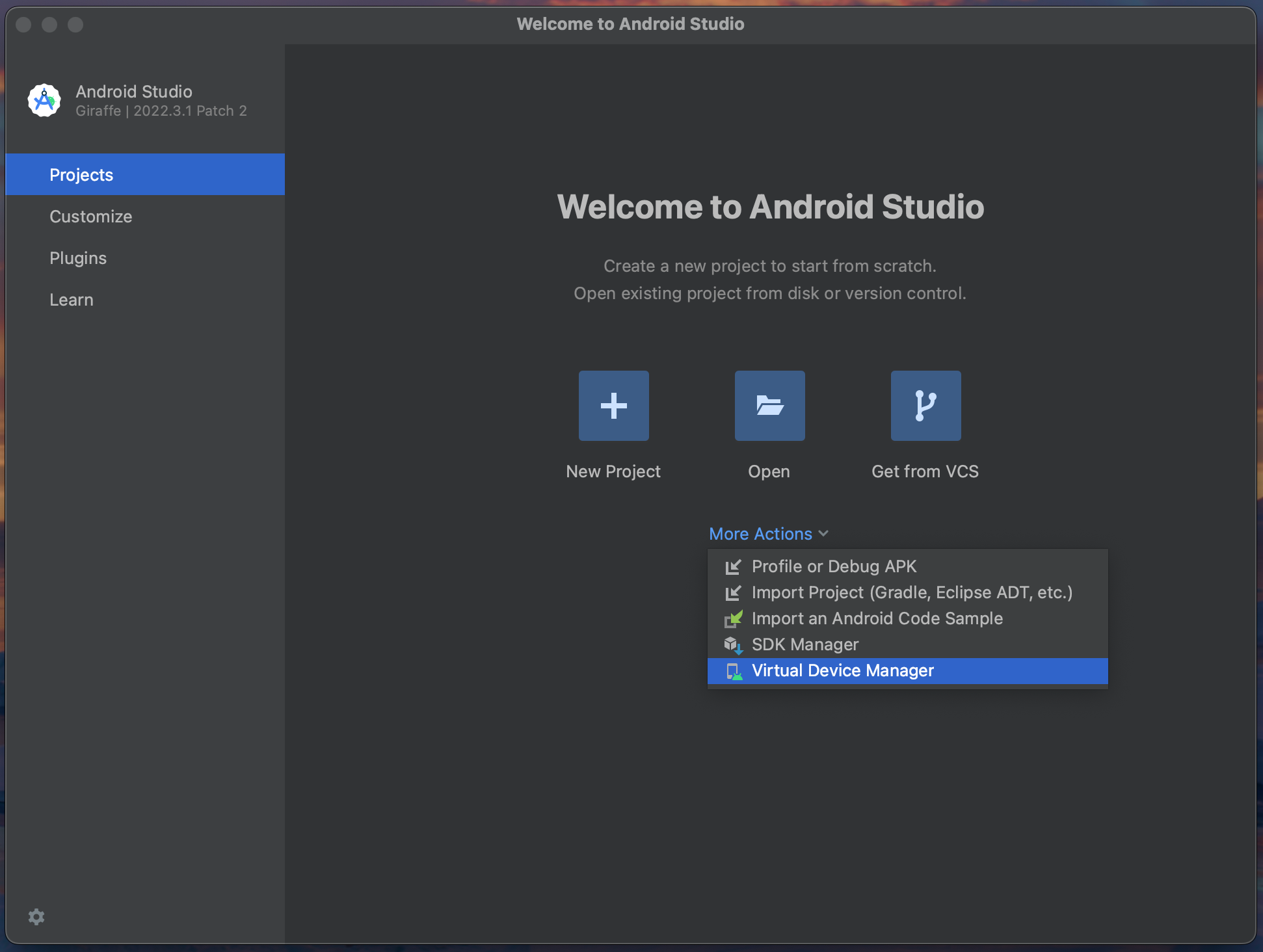 Para acessar as configurações de emulador precisamos clicar no menu “More Actions” e ir na opção “Virtual Device Manager”.