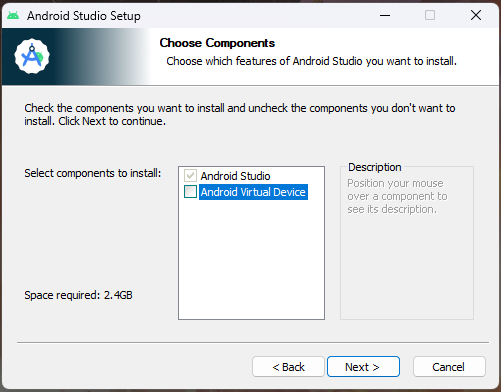 De início basta clicar em Next, sem segredos. Já na segunda parte vamos desmarcar a opção 'Android Virtual Device'. Essa opção diz respeito ao emulador padrão, e não precisaremos dele pois criaremos um emulador manualmente nesse artigo.
