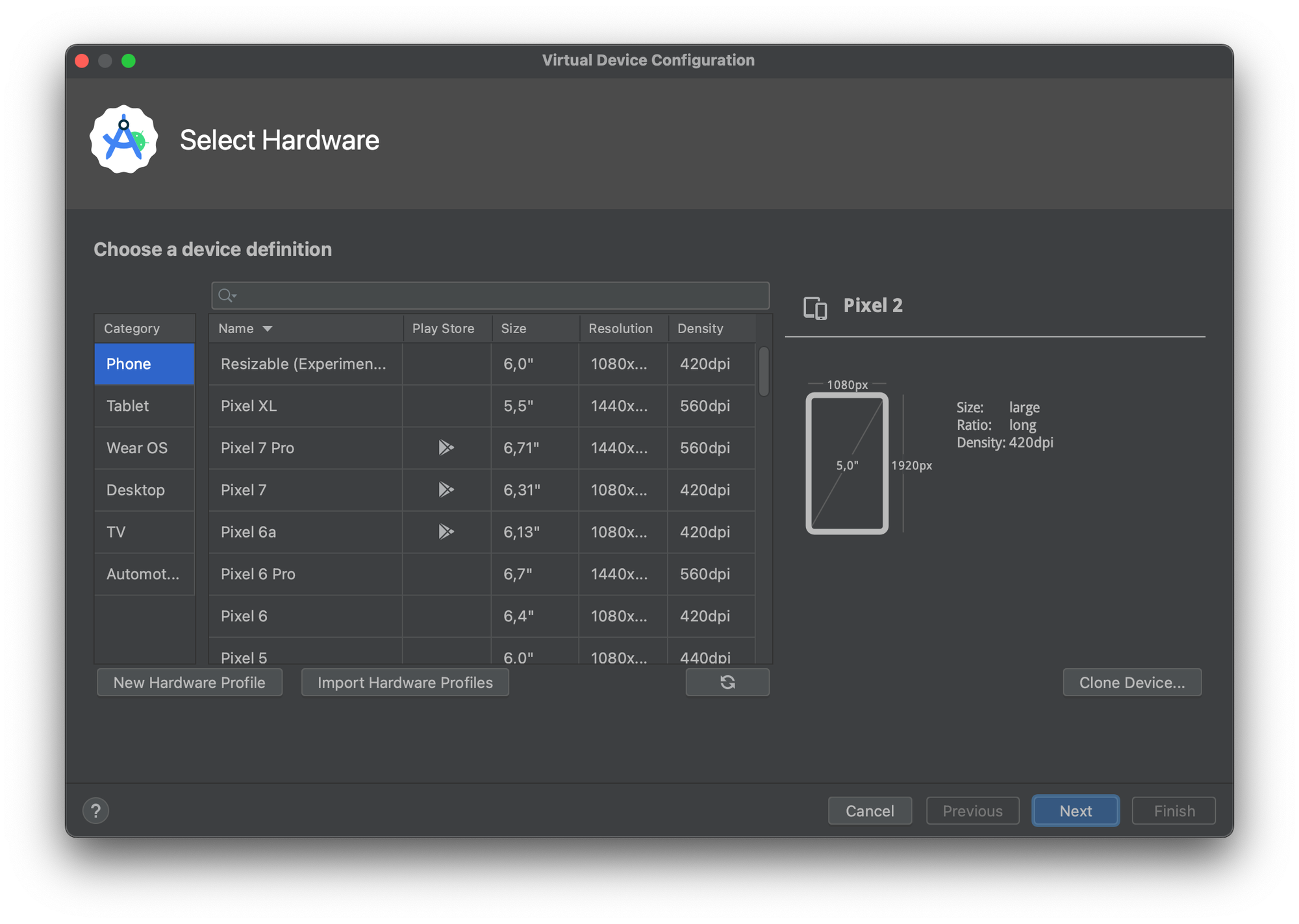 Podemos clicar em "Create Device" para começar o processo de criação de um novo emulador. Na primeira tela iremos escolher o hardware que o emulador irá replicar. Basicamente vamos escolher a resolução de tela do emulador. Recomendo escolher o modelo mais básico do Pixel, aqui irei escolher o Pixel 7.