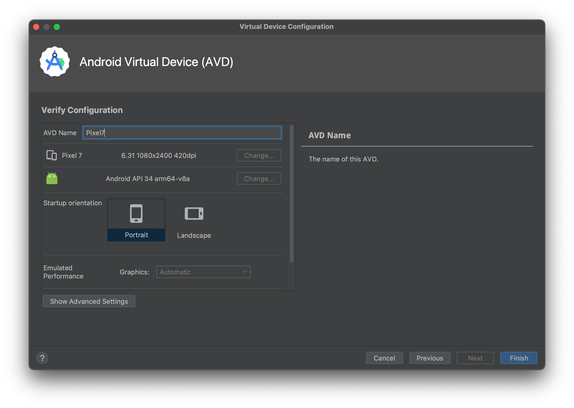 Na próxima tela podemos alterar o nome do Emulador e ao clicar em “Show Advanced Settings” teremos outras opções de configuração do Emulador, como a quantidade de memória RAM que o emulador vai poder utilizar e também a quantidade de armazenamento que o emulador poderá ocupar. De toda forma, faça aqui as configurações de sua preferência e depois basta clicar em Finish.