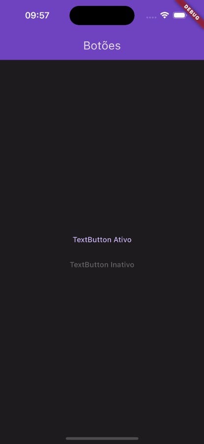 Começarei pelo TextButton, antes conhecido por FlatButton, que é um trecho de texto puro que serve como botão. Criei dois botões, um ativo e outro inativo. O ativo contém uma função vazia no "onPressed" enquanto o inativo recebeu "null" nessa propriedade, fazendo com que de fato ele fique inativo. Lembrando que sempre vou estar ajustando o uso da palavra "const" para evitar os warnings do VSCode. Aqui o código para os botões do tipo TextButton: