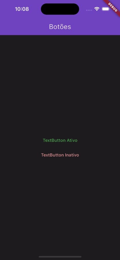 Como esse tipo de botão é mais simples e utilizado quando queremos de fato um texto, a sua customização pode ser tão simples quanto. Claro, é possível adicionar um background e coisas do tipo, mas caso o tipo de botão desejado seja um que tenha background, é melhor utilizar outro tipo e não o TextButton, logo, só modifiquei as cores do texto para indicar um pouco da customização possível nesse tipo de botão.
