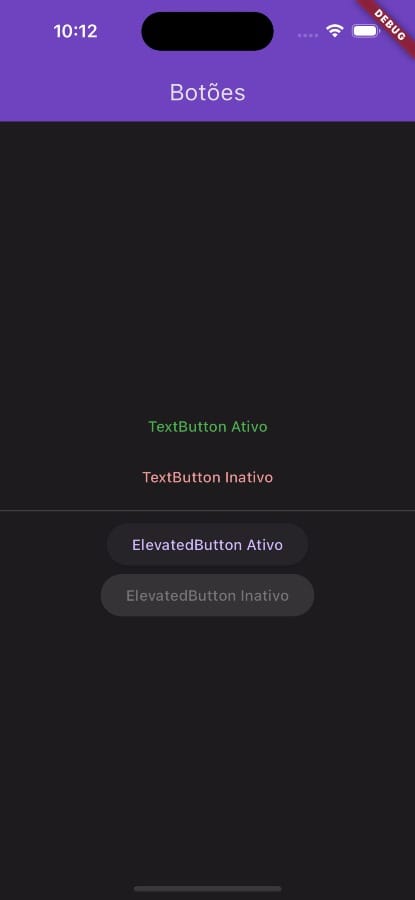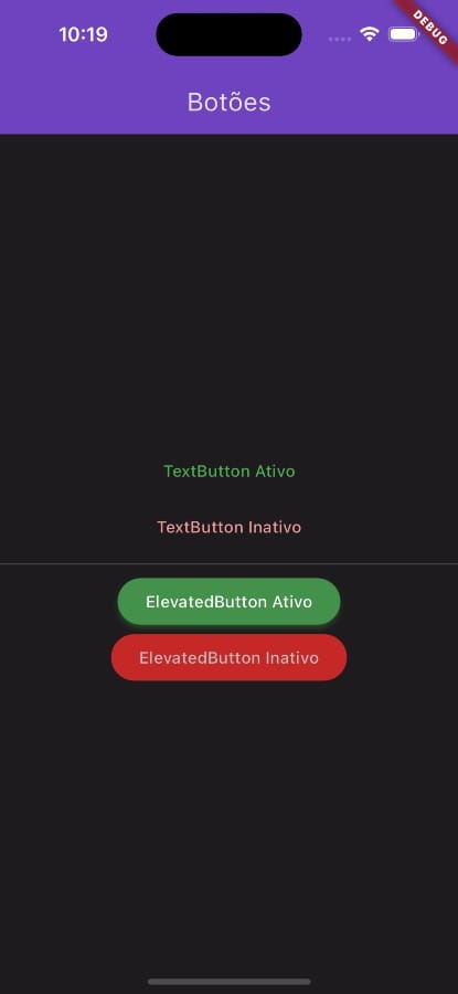 const Divider(), Agora vamos para o ElevatedButton, antigamente conhecido como RaisedButton, aqui já temos uma diferença bem clara, o background no texto do botão. Farei como no exemplo anterior, iniciando com um botão ativo e outro inativo, aqui o código: