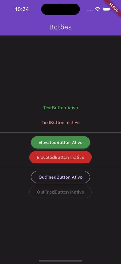 O próximo exemplo é o OutlinedButton, antes conhecido como OutlineButton, sim, só adicionaram uma letra nessa mudança. Esse botão é bem similar Ao exemplo anterior, porém ao invés de termos todo o background, temos apenas uma linha circulando o texto utilizado. Aqui o código para mais exemplos ativos e inativos: