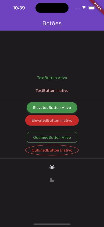 Existe também o IconButton, que como o nome diz, utiliza-se de um ícone para indicar o botão. Existem diversas variações desse daqui, então para não estender muito o artigo vou apenas citar e dar um pequeno exemplo dele, certo? Ele pode virar assunto principal em outro artigo quem sabe. Aqui o código de dois botões do tipo Icon, um ativo com um ícone de Sol e outro inativo com o ícone de Lua.