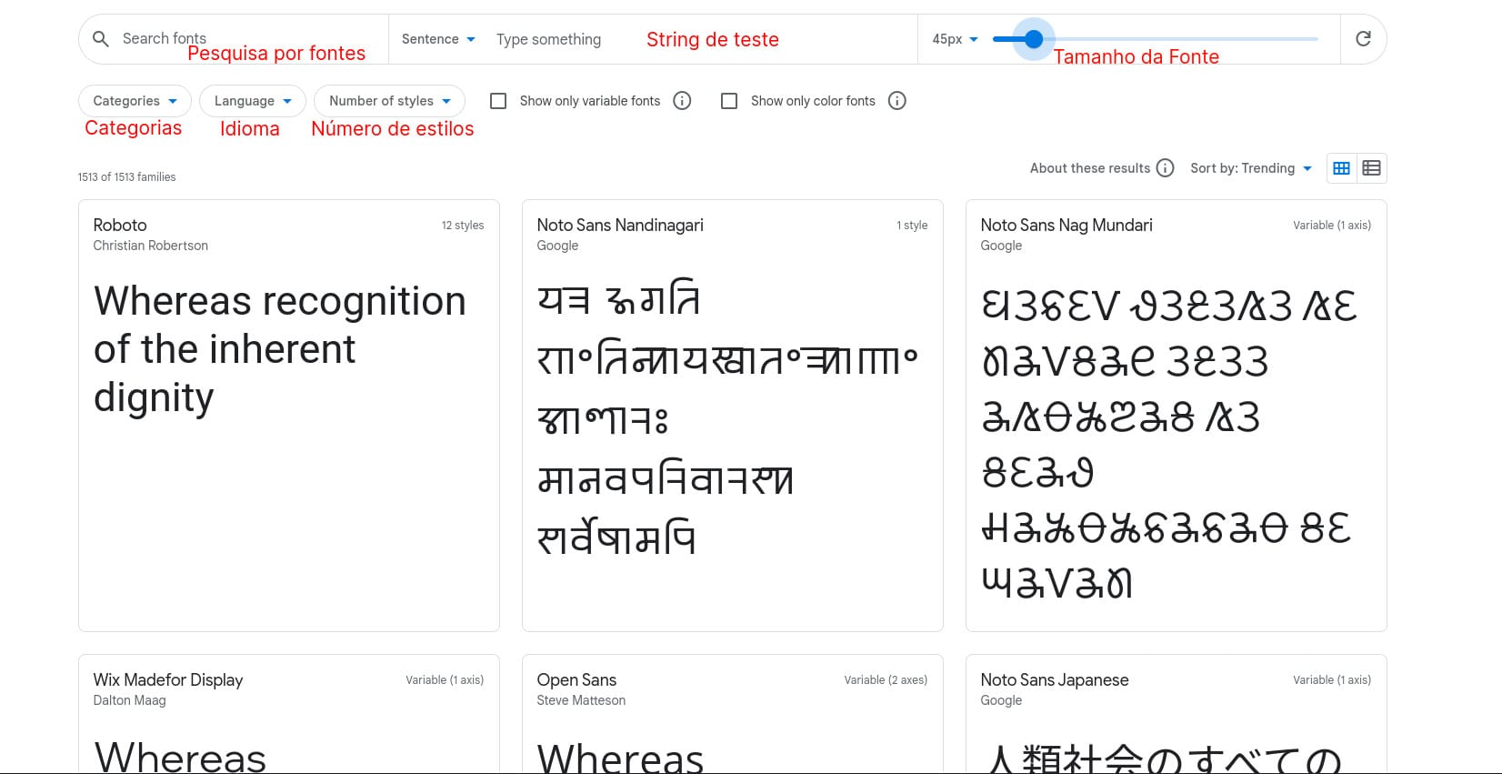 O Google Fonts é um site de fontes do Google que pode ser acesso através do link fonts.google.com. Uma vez que você esteja no site, você pode começar a buscar por uma fonte que lhe agrade entre as fontes disponíveis. É possível fazer uma busca no site filtrando pelo nome da fonte, categorias, idioma, número de estilos da fonte e é possível visualizar a fonte em diferentes tamanhos e com uma string de teste específica.