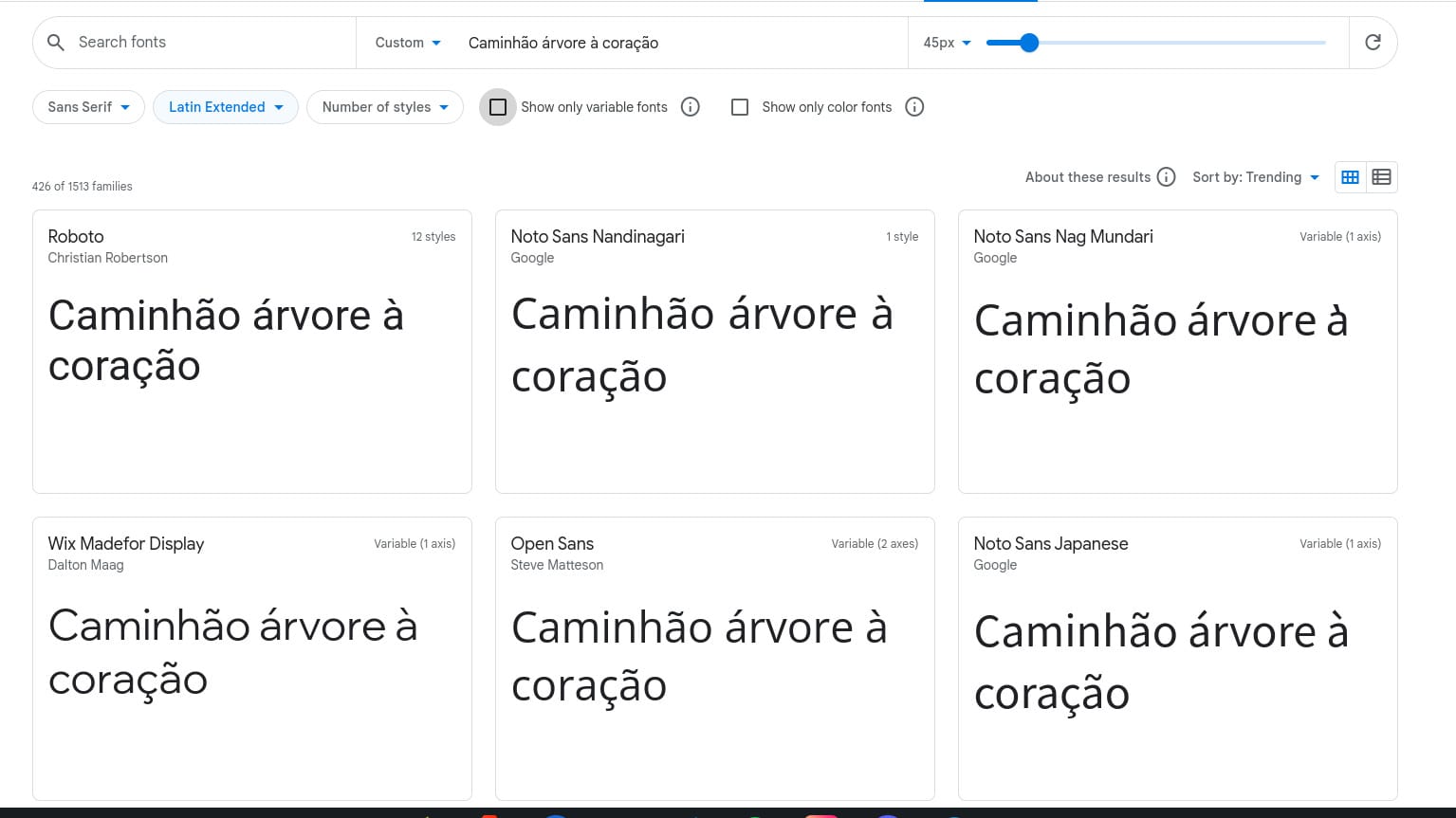 Ao colocar uma string de teste, é possível ver como essa string se parece em todas as fontes mostradas na tela. Se a sua aplicação utilizar a língua portuguesa, recomendo que você faça um teste colocando palavras acentuadas na string de teste para ter certeza que a fonte que você selecionou tem o suporte correto a este tipo de caractere.
