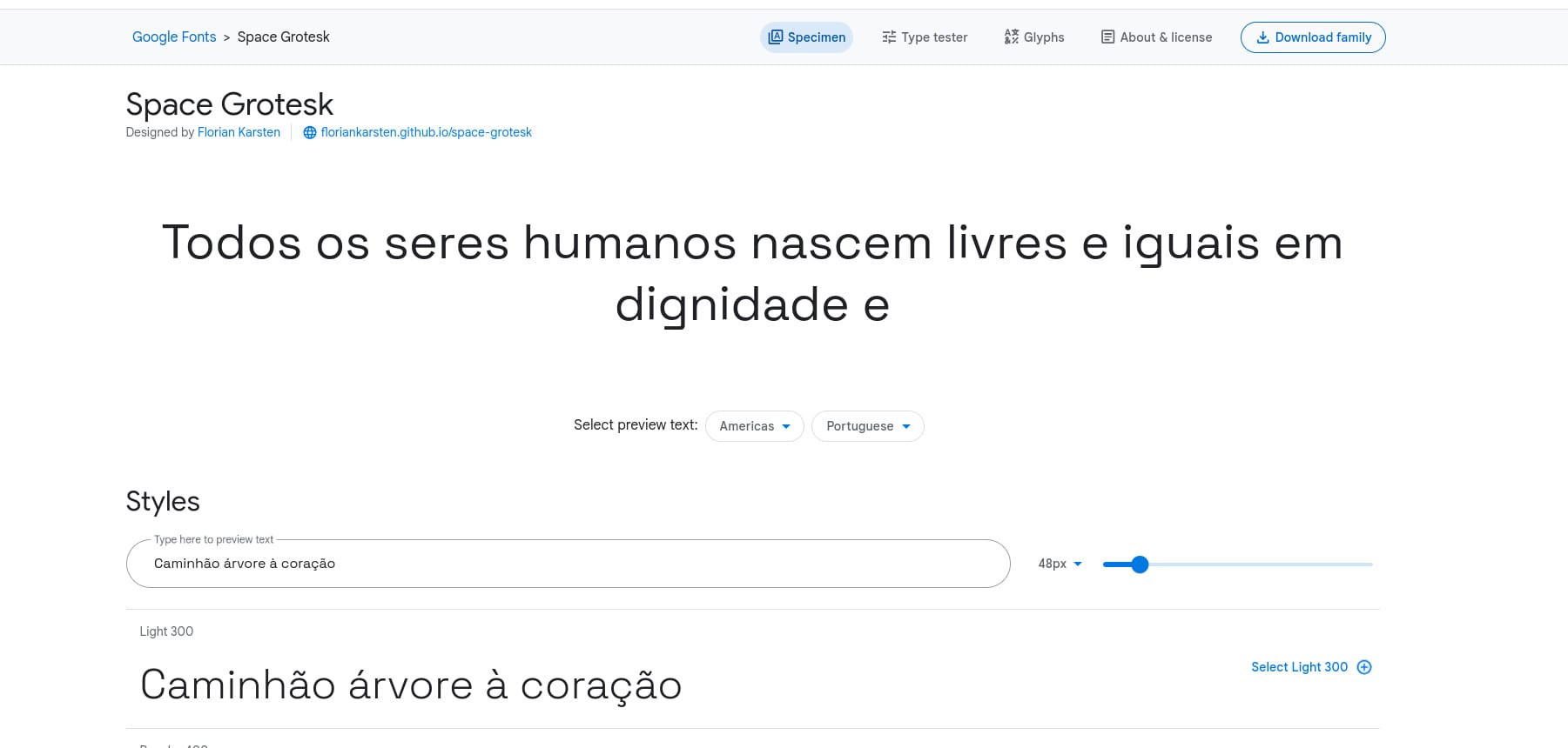 Uma vez selecionada uma fonte, você pode especificar uma língua para ver o texto de teste padrão da fonte para aquela língua e as variações disponíveis na fonte. Também é possível fazer um teste de escrita com a fonte, ver todos os caracteres existentes na fonte e obter mais informações sobre a fonte e sobre a licença que ela utiliza nessa mesma página. Verificar a licença utilizada pela fonte é importante para garantir que a fonte que você escolheu pode ser utilizada para o seu objetivo.