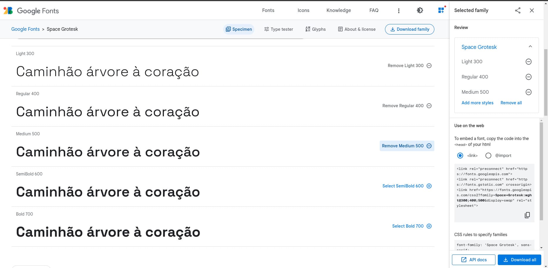 Também é possível fazer o download da fonte clicando no botão Download all. Isso fará o download de todas as fontes em um arquivo zip.