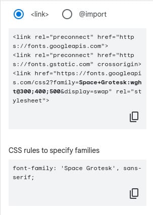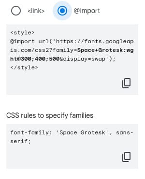 Uma forma alterativa de fazer a inserção da fonte é através do CSS. Para isso, é preciso selecionar a opção @import, copiar o código que aparece no primeiro bloco de código e inseri-lo na tag head do seu documento HTML, ou então copiar apenas o @import e adicioná-lo no documento onde você está desenvolvendo seus estilos. Depois disso, basta adicionar o código CSS mostrado no segundo bloco de código ao seletor CSS que representa os elementos onde você deseja adicionar essa fonte.