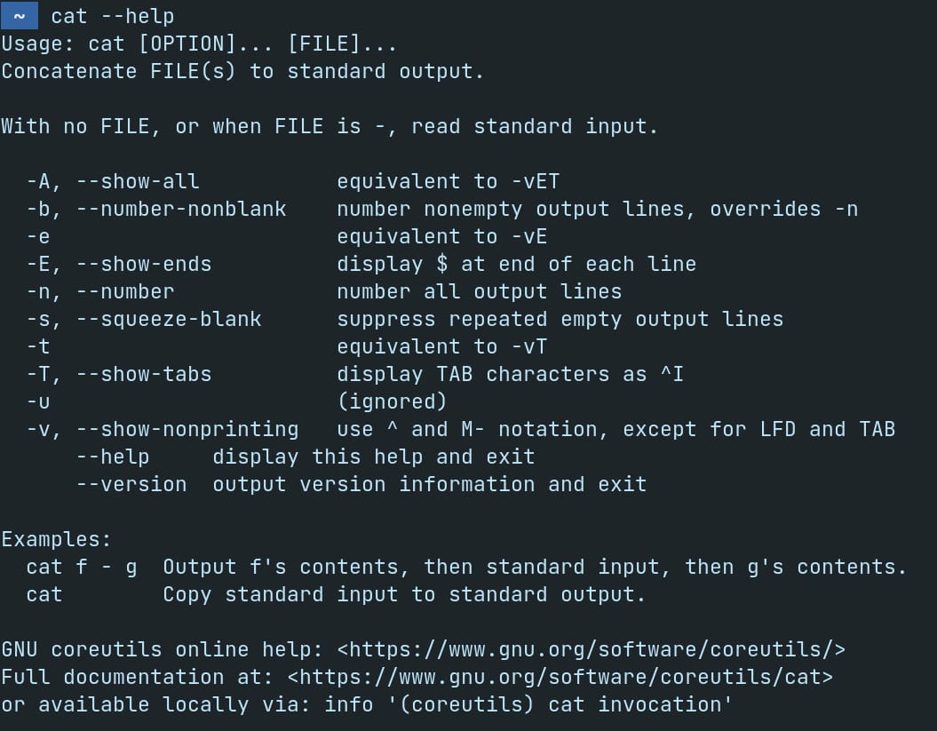 O que esse parâmetro faz é exibir uma ajuda rápida sobre o comando que você está utilizando, informando o que esse comando é, como utilizá-lo e em alguns casos até mostrando exemplos de utilização. Abaixo você pode ver o resultado do comando cat --help, ou seja, a ajuda de uso do comando cat.