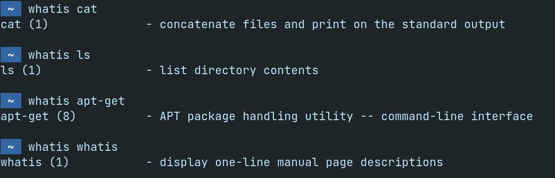 O comando whatis nos retorna uma descrição curta sobre outro comando. Nessa descrição, é possível ver o que o comando faz. Na imagem abaixo, você pode ver o que esse comando nos informa sobre vários outros comandos: