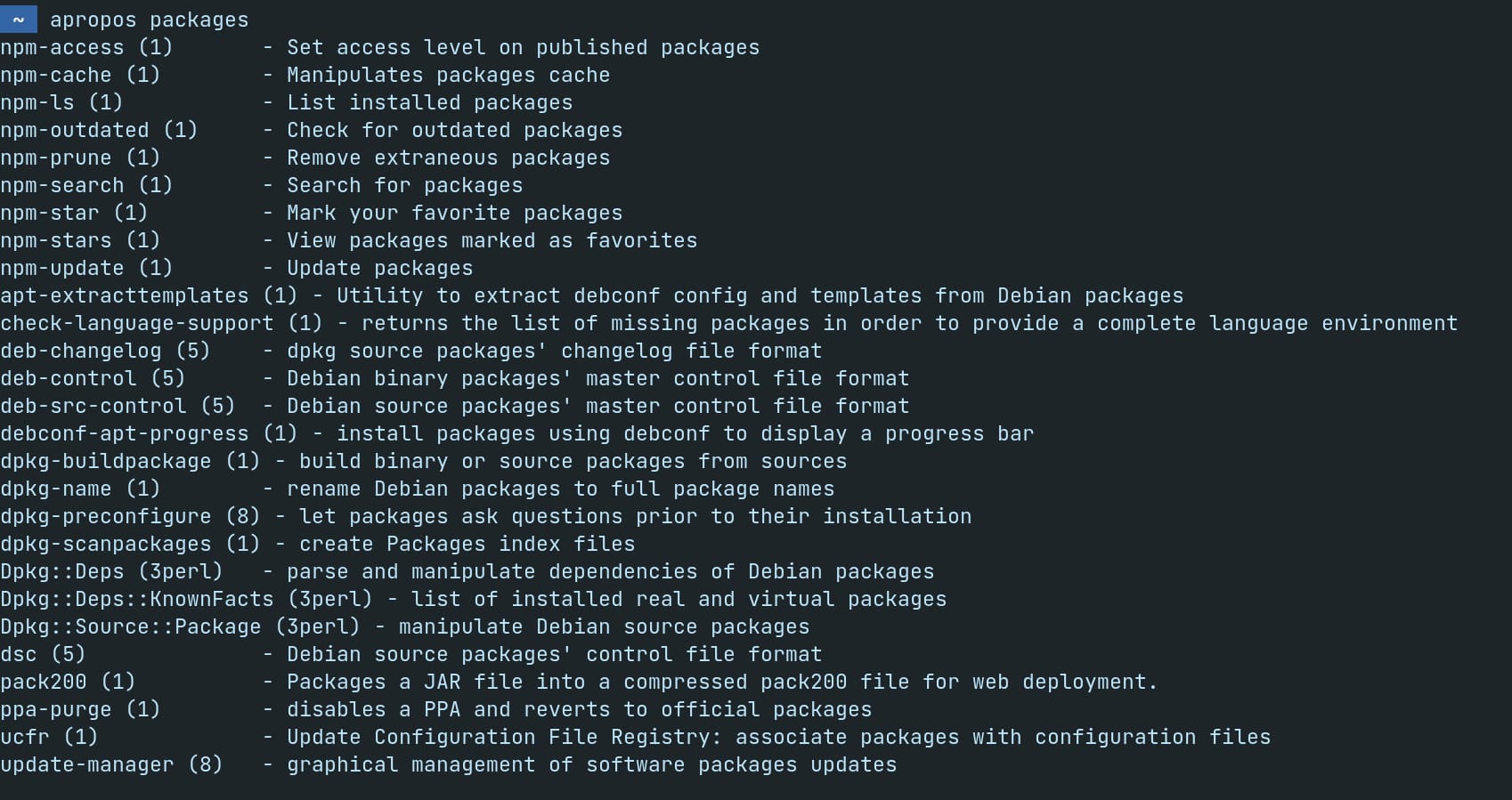 O comando apropos é extremamente útil quando você estiver precisando utilizar um comando, mas não sabe muito bem qual comando é esse. O comando apropos vai procurar nas páginas de manual do seu sistema pelas palavras-chave que você informar a ele, e vai retornar todos os comandos que possuem aquela palavra, dessa forma você pode fazer uma pesquisa entre os comandos existentes na sua máquina para encontrar o que deseja.