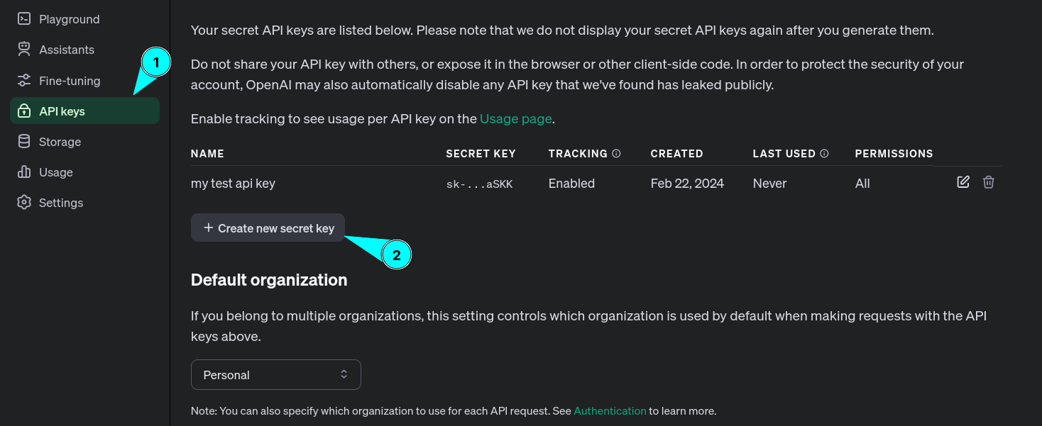 Antes de começarmos a usar a API da OpenAI é necessário criar uma conta na openai (caso ainda não possua uma). Em seguida, faça login, nague até a tela API Keys e clique em "Create new secret key":