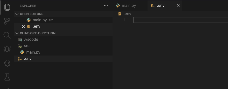 Depois crie o arquivo main.py e um .env no seu editor de código como na imagem abaixo: