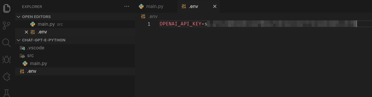 Dentro do arquivo .env iremos guardar a nossa API KEY, para fazer isso basta definir uma variável OPENAI_API_KEY e o seu valor será a chave gerada na introdução.