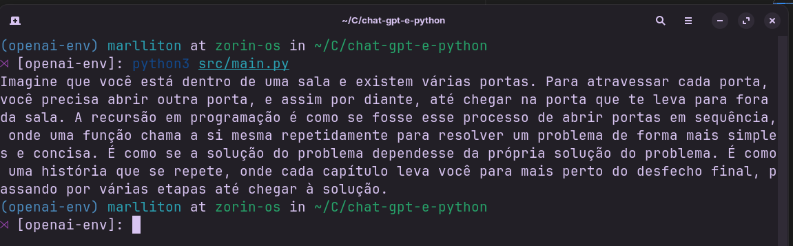 Por fim, temos a impressão da mensagem obtida como resultado da nossa consulta. Essa mensagem está envolta em alguns objetos e por isso a forma de acesso a essa informação acaba sendo um pouco longa, como completition.choices[0].message.content