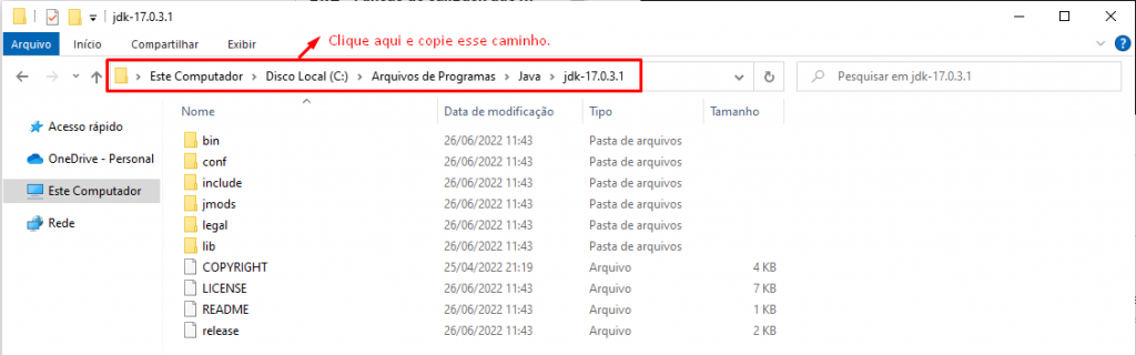 Para criarmos essa variável de ambiente, basta seguir esse passo a passo. Primeiramente, precisamos encontrar nossa pasta do Java, e o caminho para essa pasta dependerá de onde você salvou. Por padrão, quando você instala o Java a partir da instalação expressa com o executável jdk.exe ele irá para, C:\Program Files\Java, mas se você baixou o .bin (binário), estará na sua pasta de downloads ou então em outro lugar que você tenha selecionado. Depois que encontrarmos essa pasta, precisamos entrar nela copiar o diretório do JDK como no exemplo a seguir: