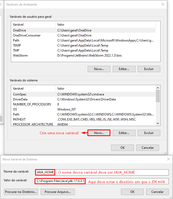 Para configurar o Java corretamente, precisamos criar uma variável de ambiente que aponte para a pasta \bin da JDK, ou seja, o conteúdo da variável será o caminho relativo até a pasta da JDK. Vamos criar uma variável chamada JAVA_HOME para nos ajudar nisso já que esse é o nome recomendado para a variável de ambiente do Java por ser o padrão utilizado pela comunidade, mas você pode nomear como achar melhor.