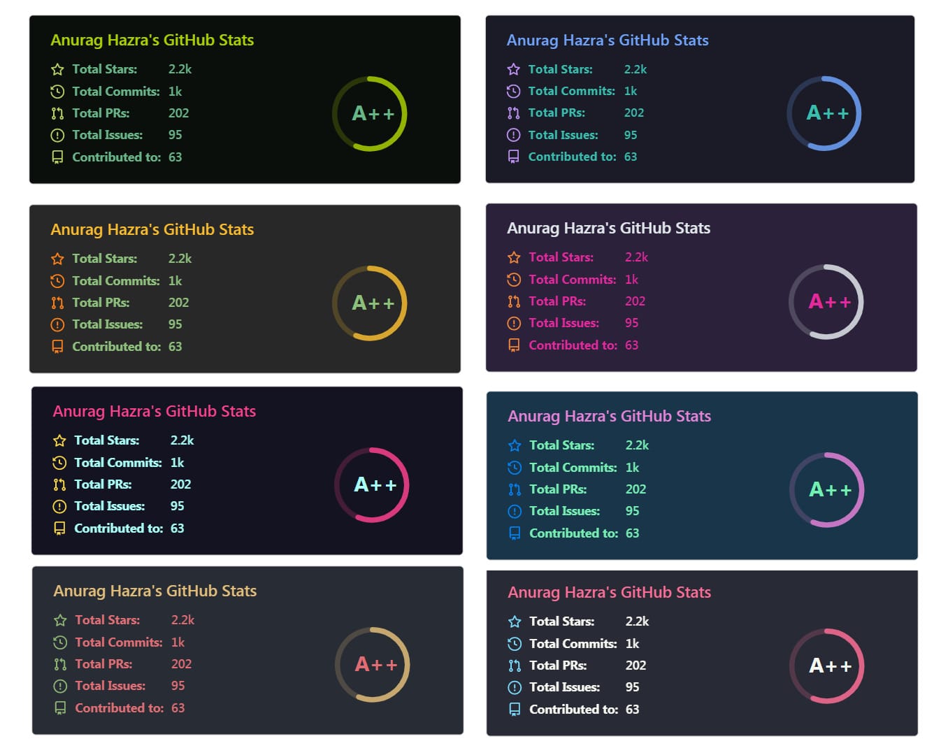 O repositório mais famoso desses cards é o repositório anuraghazra/github-readme-stats. Os cards podem ser personalizados com diferentes temas e podem ter algumas informações ocultadas, permitindo que você escolha quais tópicos gostaria de evidenciar no seu perfil.
