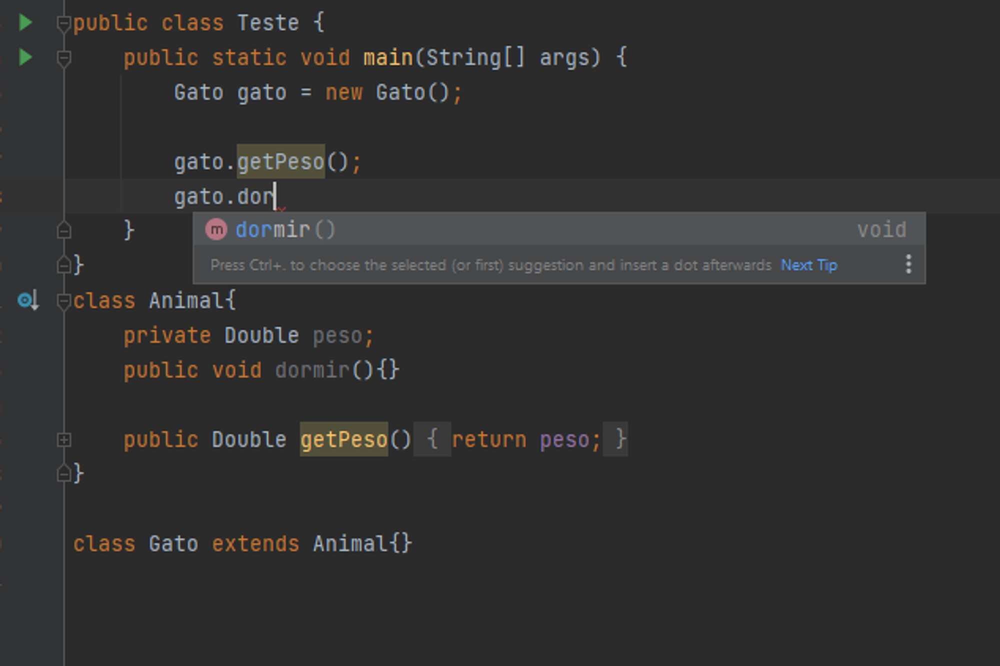 Como podemos ver, o gato consegue chamar o método getPeso() e dormir() e ter acesso ao atributo que recebeu por herança de Animal, que se torna sua superclasse/classe pai.