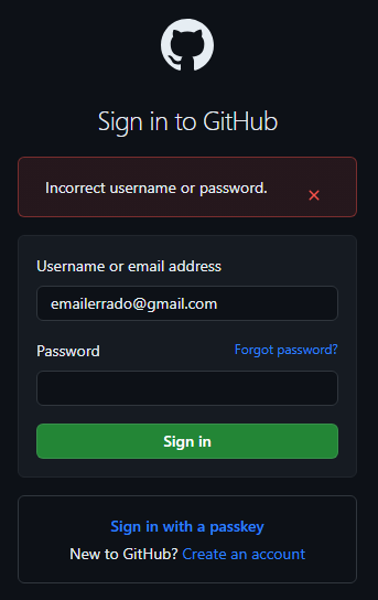 Um exemplo muito fácil de se pensar acontece quando tentamos fazer login em qualquer site ou aplicativo. No print a seguir tentei fazer o login no site do GitHub com um email que não possui cadastro no sistema. A mensagem retornada informa qual problema está acontecendo e, por consequência, a forma de se resolver tal problema.