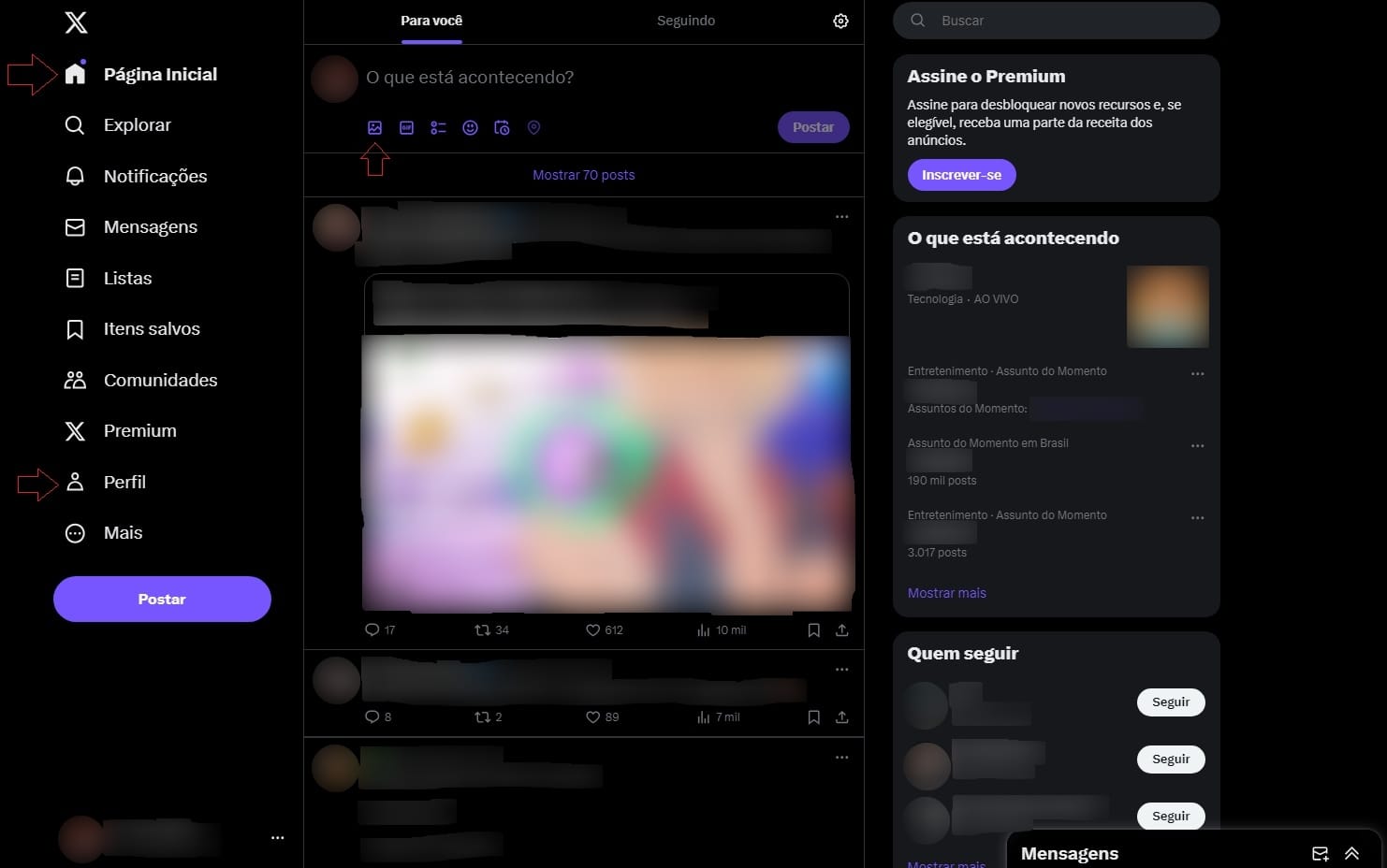 Pegando de exemplo parte da página inicial do X, finado Twitter, na Web, podemos ver diversos exemplos dessa heurística. Temos ícones familiares em todos os locais, ícone de Casa indicando a página inicial, ícone de Pessoa para indicar a página de perfil, ícone de Imagem simbolizando a inserção de uma imagem, ícone de coração para dar a ideia de que um post foi gostado/curtido. O texto em escrito também é bem familiar para todo tipo de pessoa e em toda a página, sem termos técnicos ou complexos.