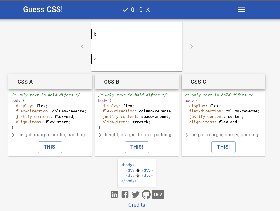 O jogo Guess CSS conta com uma imagem de uma tela gerada com HTML e CSS, o HTML usado e três opções de CSS. Você deve então selecionar a opção de CSS que irá fazer com que o HTML mostrado seja formatado conforme a figura. No topo da página, temos um placar onde é mostrado quantos acertos e quantos erros você fez.