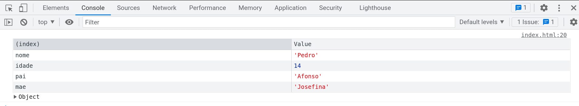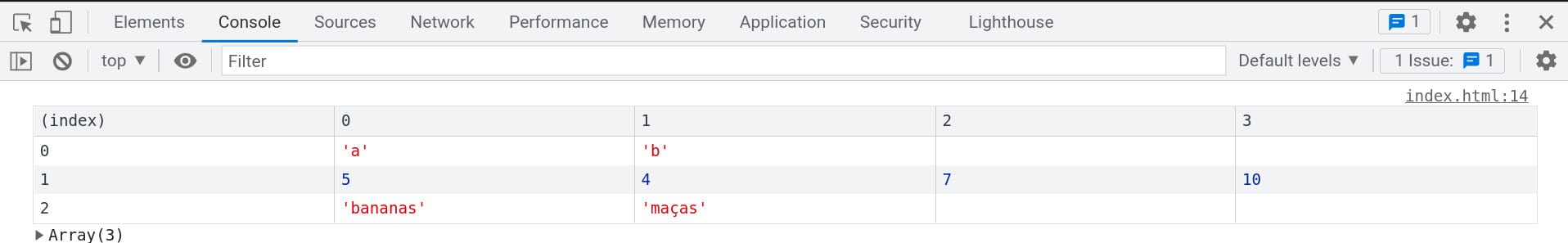 Esse método imprime informações no console no formato de tabela e pode receber como parâmetro objetos ou arrays. A exibição no formato de tabela pode ser muito útil se o seu intuito é visualizar o conteúdo de uma variável que armazena esses tipos de dados.