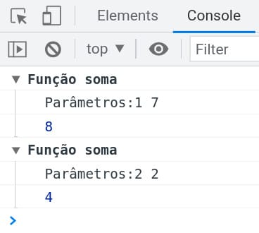 soma(2, 2) O exemplo acima é um exemplo básico, utilizando uma função que fará a soma de dois números. Nessa função, eu desejo imprimir alguns dados, no caso, os parâmetros e o resultado, e para isso, defini um grupo com o rótulo “Função soma”. Uma vez que o código seja rodado, o console terá o seguinte conteúdo: