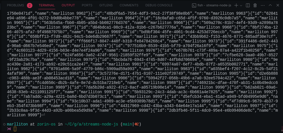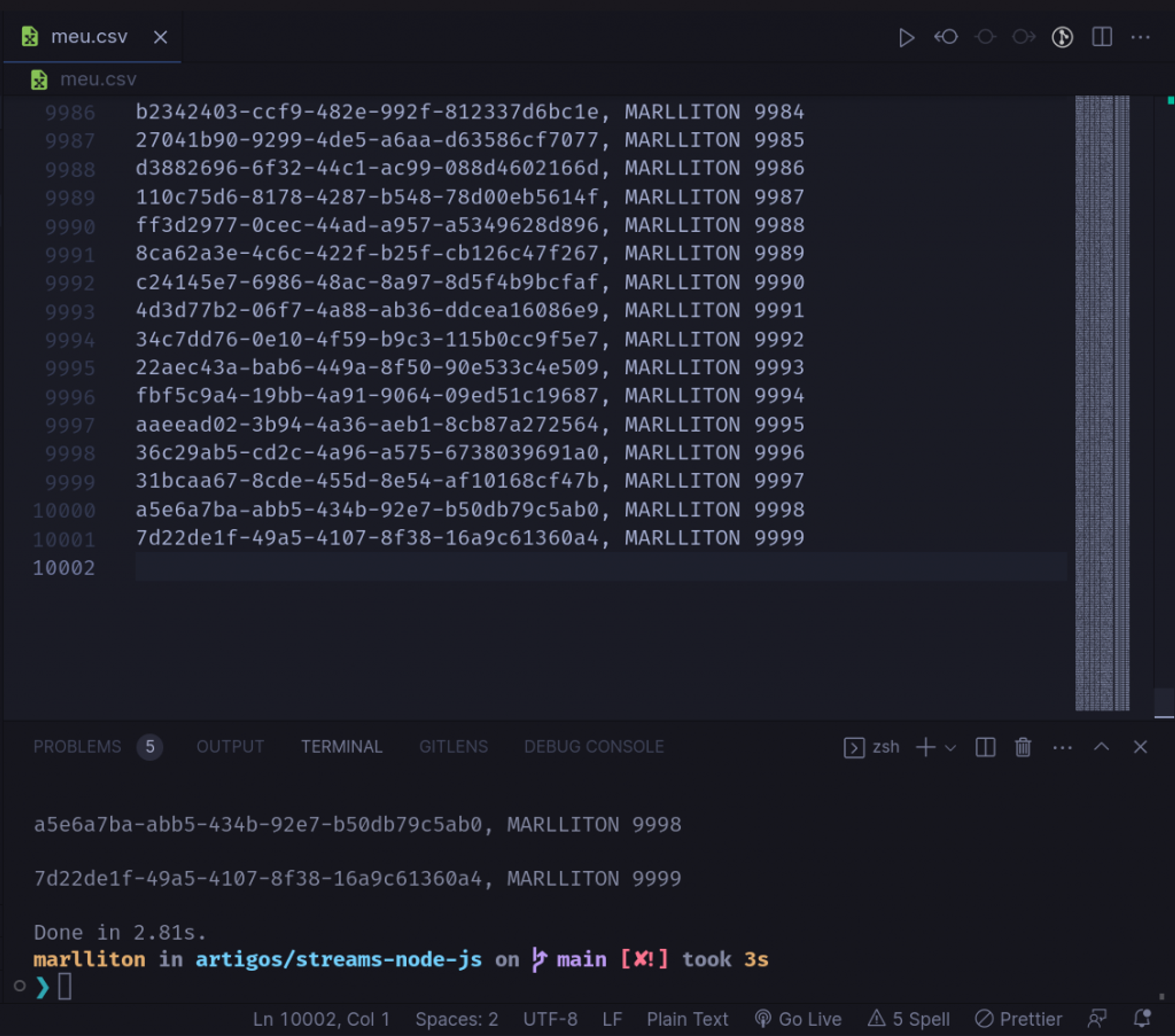 Após a execução da transform stream, os dados estão no formato desejado, mas para podermos analisar todas as linhas de forma simples, precisamos salvar esses dados em algum arquivo csv.