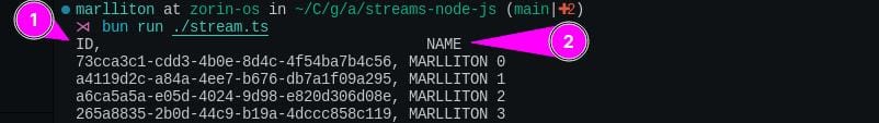 .pipe(process.stdout) Ao passar por mais essa etapa de transformação, os dados passarão a ter um cabeçalho que identifica os campos como id e name, e o resultado será: