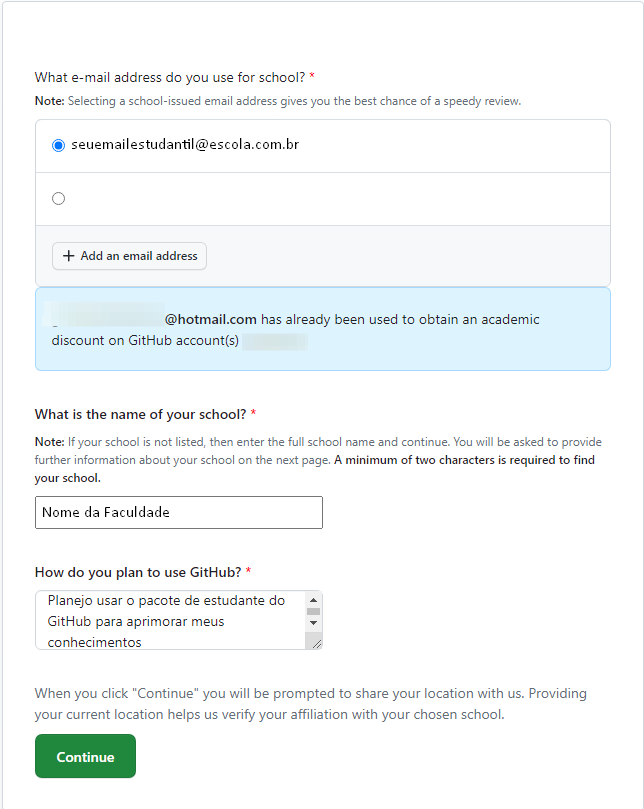 Lembrando que o GitHub verificará as informações e pode demorar um tempo até eles responderem a sua solicitação, portanto, não se preocupe!