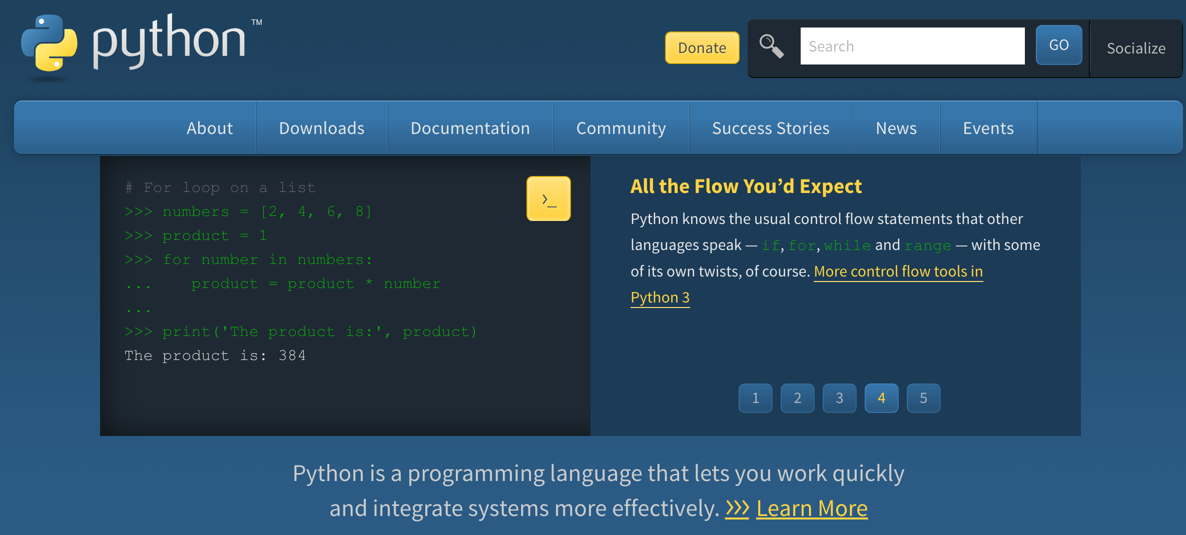 O primeiro passo para instalar o Python é entrar no site oficial da linguagem. Logo de cara temos a opção de Download da mesma. Basta navegar até lá.