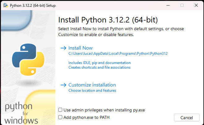 É interessante marcar a última opção “Add python.exe to PATH” para termos acesso completo ao Python através do terminal da sua máquina. Após marcar essa opção, podemos ir à opção “Install Now”. Após alguns segundos, tudo estará pronto.