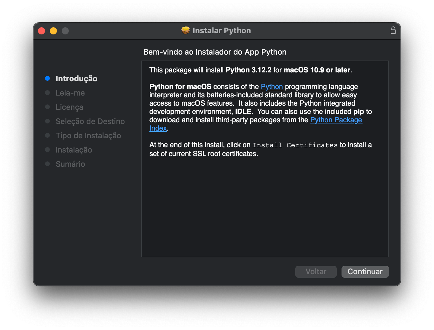 No MacOS temos formas diferentes de se instalar o Python, a primeira é a mais simples, ao baixar o arquivo do site oficial e abrir o mesmo a tela de instalação será iniciada. Nessa tela, basta fazer o passo a passo básico de uma instalação e pronto, tudo instalado.