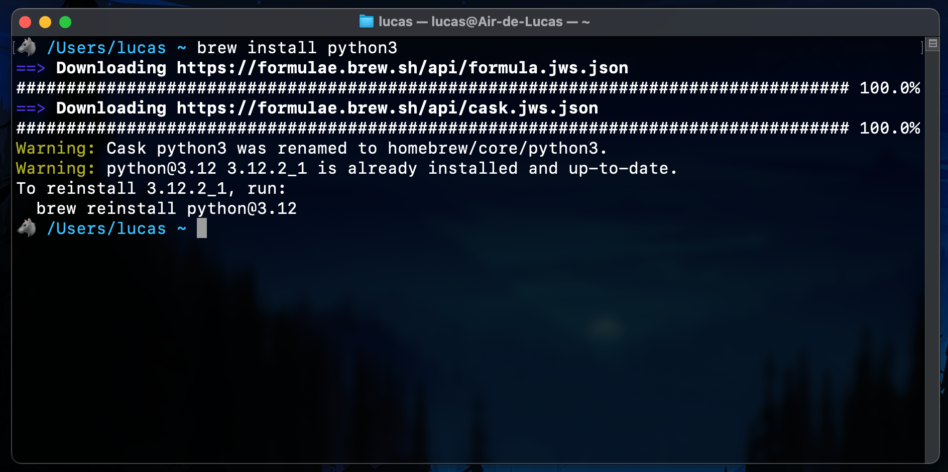 Já na outra forma de se instalar, vamos utilizar o brew. Caso não conheça essa ferramenta, temos um post aqui no blog sobre ela. Com a ferramenta em mãos, basta utilizar no terminal o comando brew install python3 e pronto, o Python será instalado.