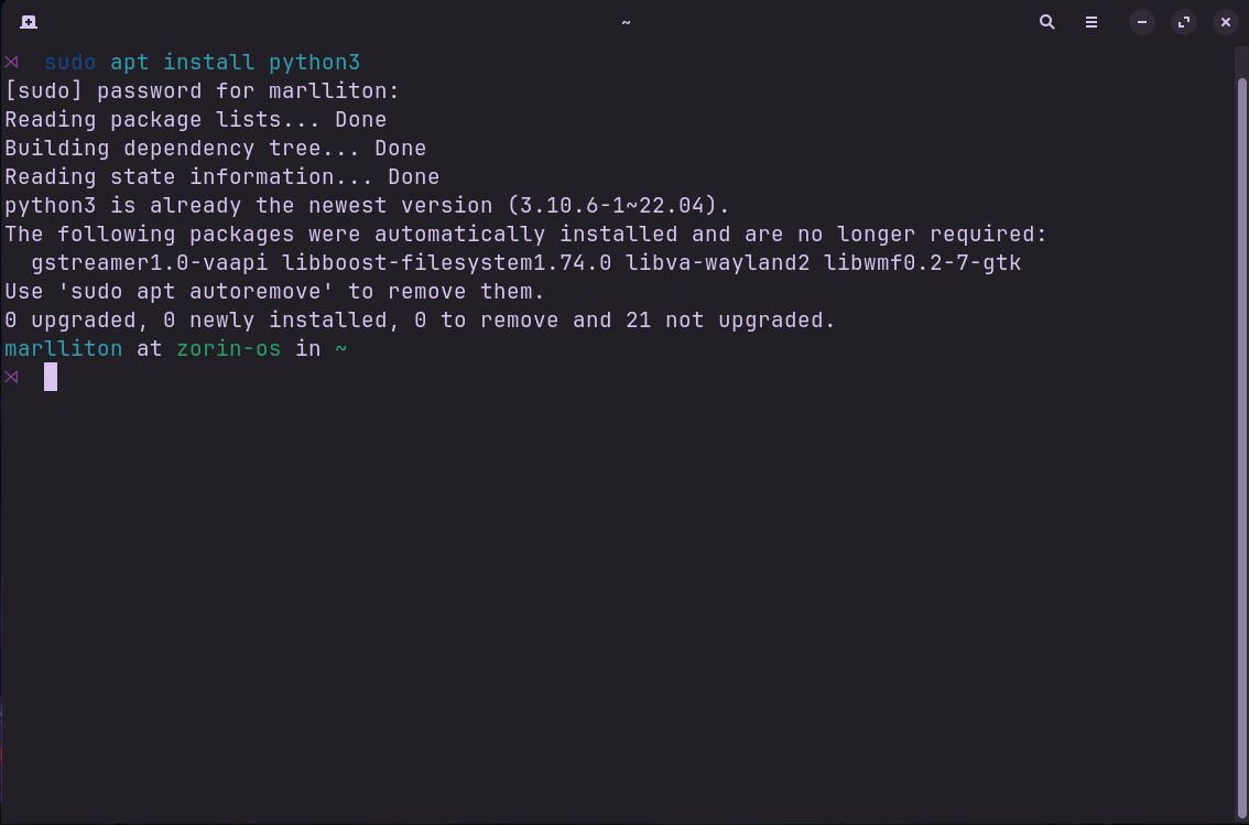 A forma de instalar dentro do Linux é diretamente pelo gerenciador de pacotes. Como para esse tutorial estou utilizando um sistema Linux baseado em Ubuntu, vou usar o comando sudo apt install python3 no terminal, mas esse comando pode variar conforme a distro que está sendo utilizada.